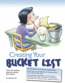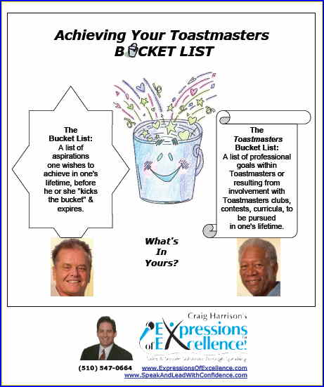 Creating Your Bucket List: It's Time to Set Goals In and Beyond Toastmasters The Bucket List: A list of aspirations one wishes to achieve in one's lifetime, before he or she "kicks the bucket" and passes away. The Toastmasters Bucket List: A list of personal or professional goals within Toastmasters or resulting from involvement with Toastmasters clubs, contests, curricula, to be pursued in one's lifetime.