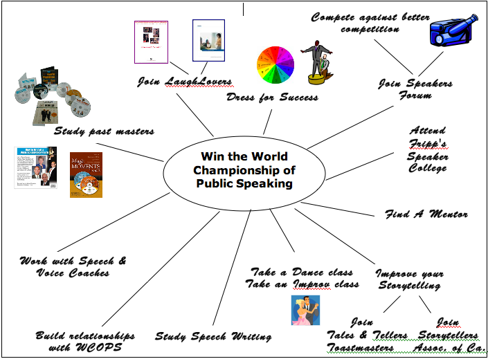 "When thinking about a goal, ask yourself, "How do I want this story to end?" Then choose to live in the story that will have this happy ending." So advises Dr. Marcia Reynolds, author of Wander Woman: How High-Achieving Women Find Contentment and Direction. Reynolds, a Certified Speaking Professional, reminds us all that we have little to lose by pursuing our bucket list goals. "Most of the time people react to a fear that is unclear. Once they articulate the possible consequences, they see that the risk is not that big. In fact, the possible gain of freedom, pride and joy is much greater than the possibility of loss." Lastly, add me to your support team so I too can support your most noble endeavor! SIDEBAR: Creating a Mind Map to Pursue A Goal For Toastmaster Dale Harmon of San Leandro California's Shelf-Talkers club (1809-57), becoming a World Champion of Public Speaking was a daunting challenge. While he competed in club and area, division and district contests, he knew it would take take more to become a Toastmasters' World Champion. Using a mind map, Dale brainstormed all the different things he could do to improve his speechmaking, body language, humor, movements, mindset and more. Stay tuned for more from Dale in the coming years!
